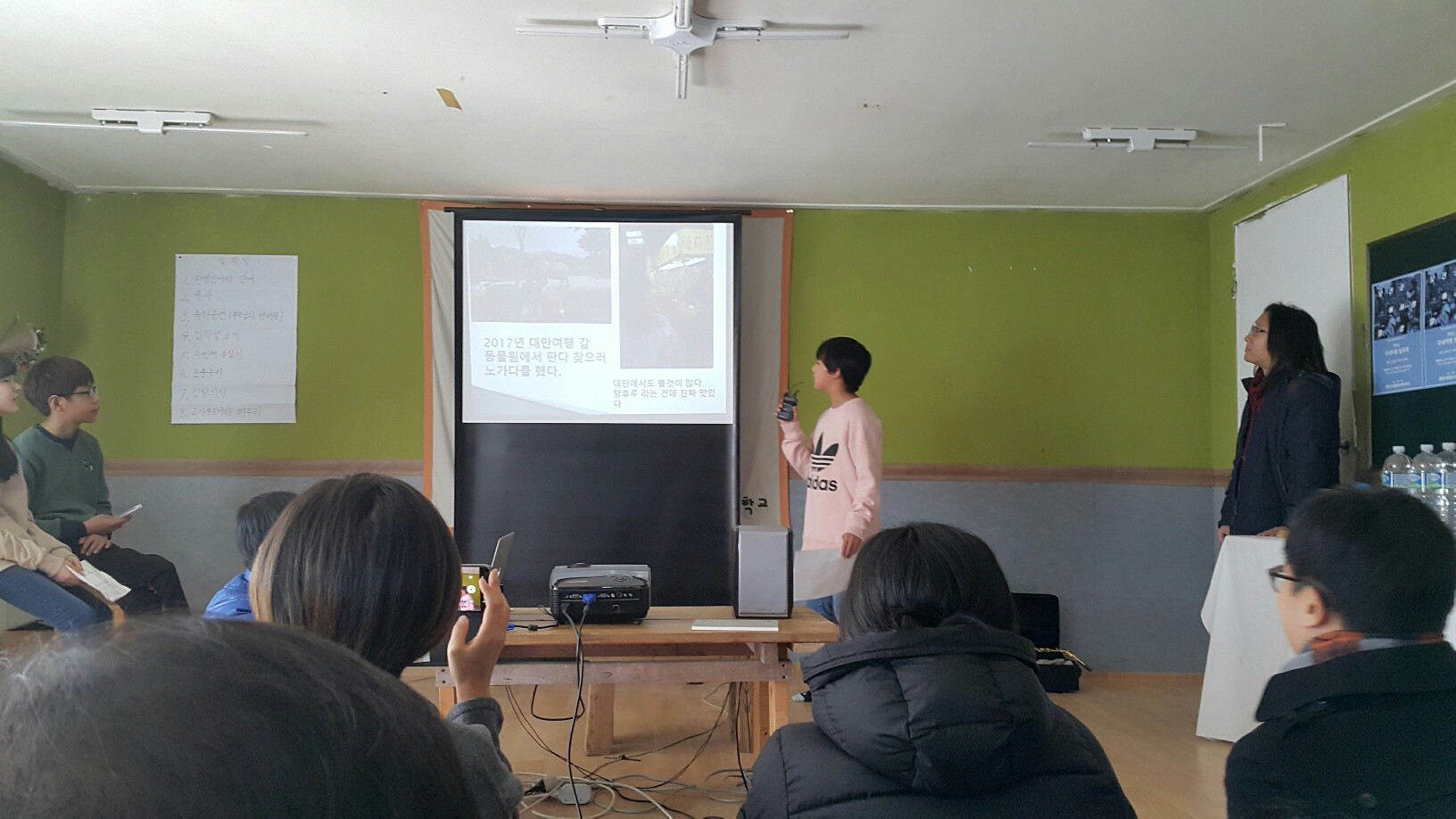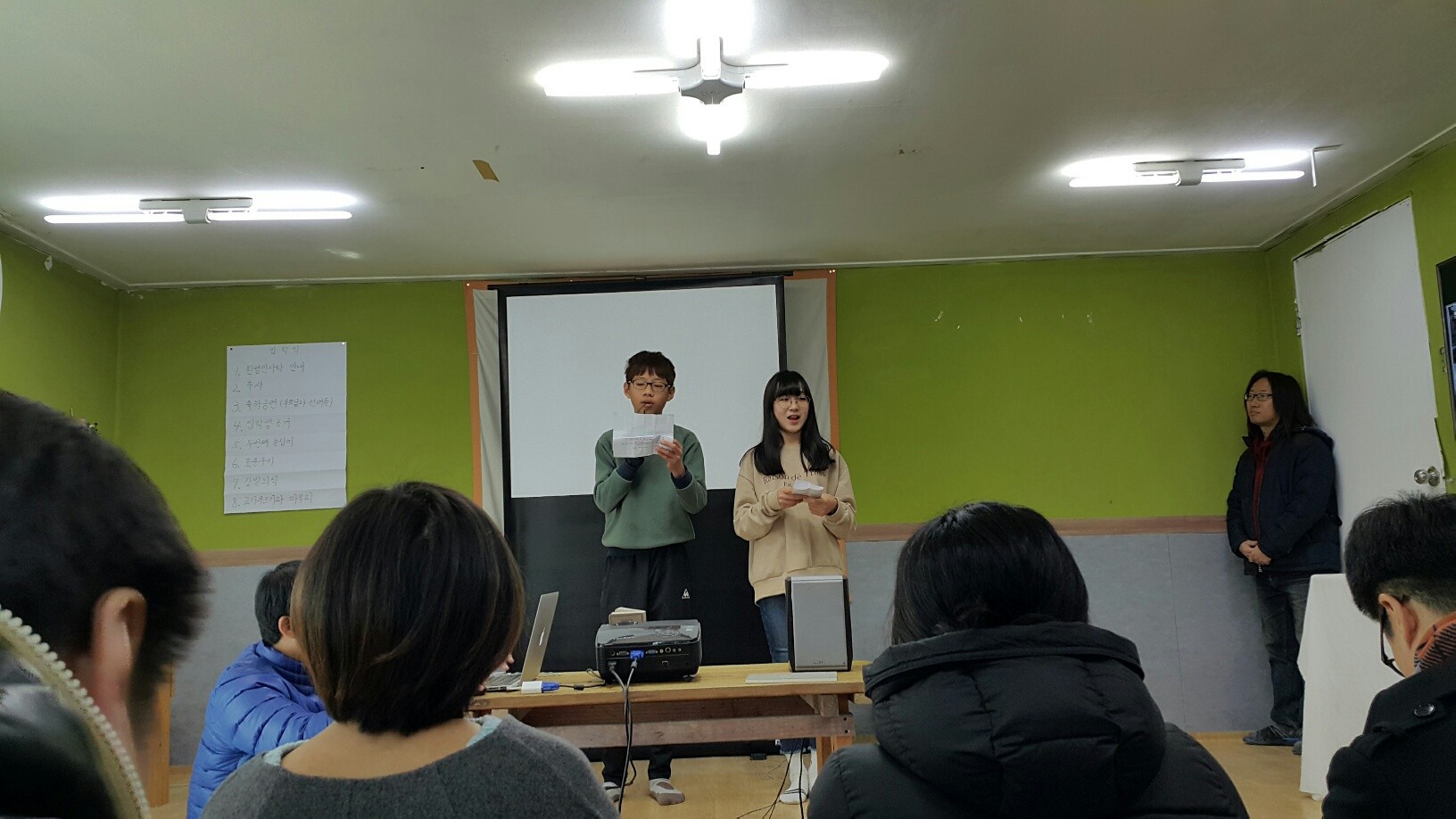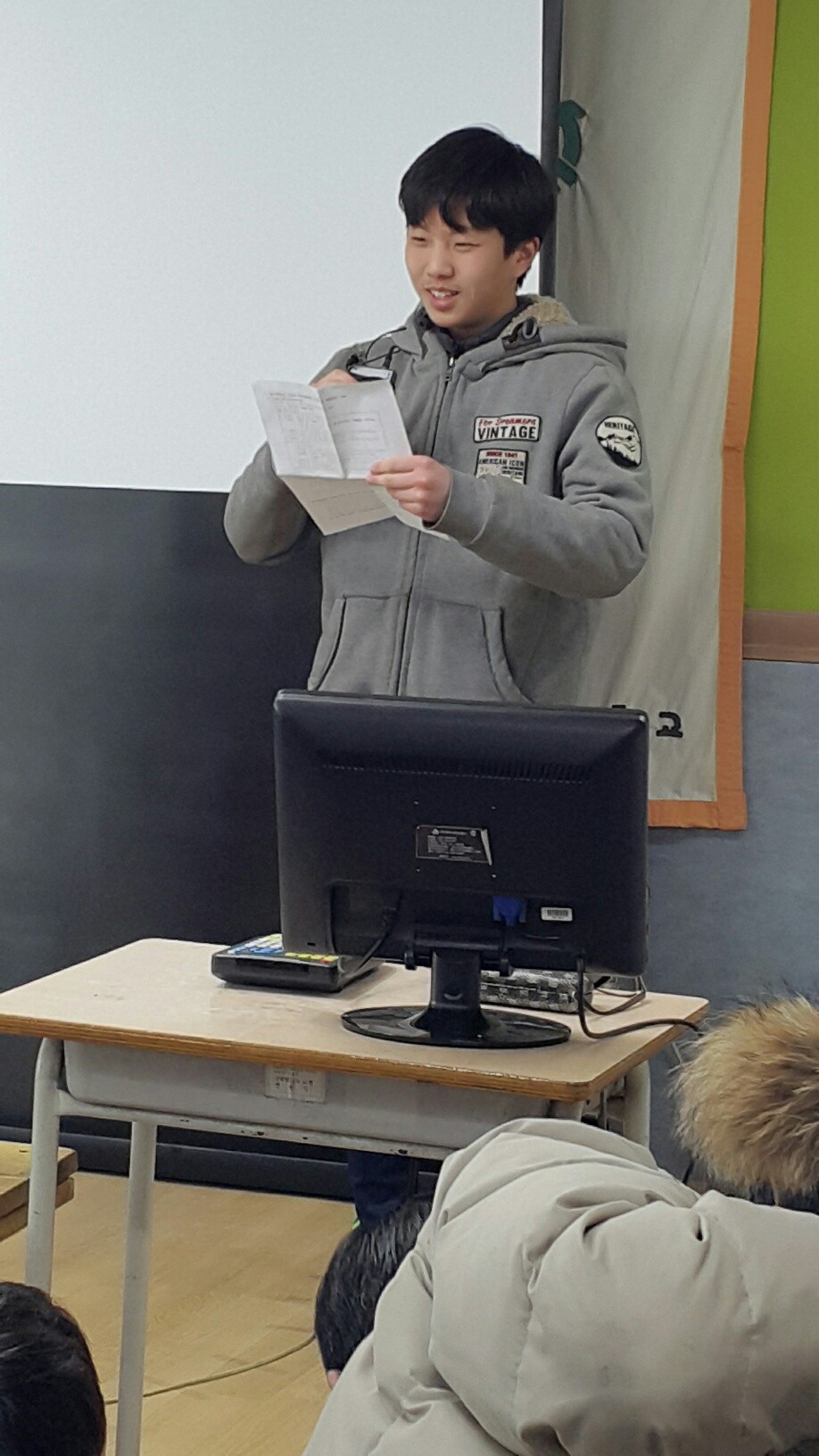 아.. 이제 아이들이 사회를 보는 순서군요. 2학년 병희와 연수네요. 연수가 쓴 대본을 병희가 읽었다고 하는데,