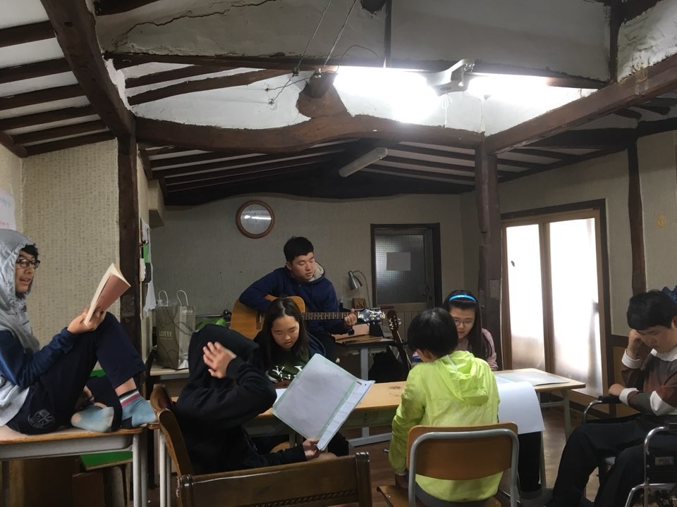 모둠별 연습 후에 앞에서 은하수 선생님의 반주에 맞춰서 노래를 부르고 있습니다.