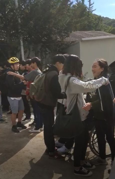 마지막으로 한 줄로 서서 포옹으로 인사합니다.