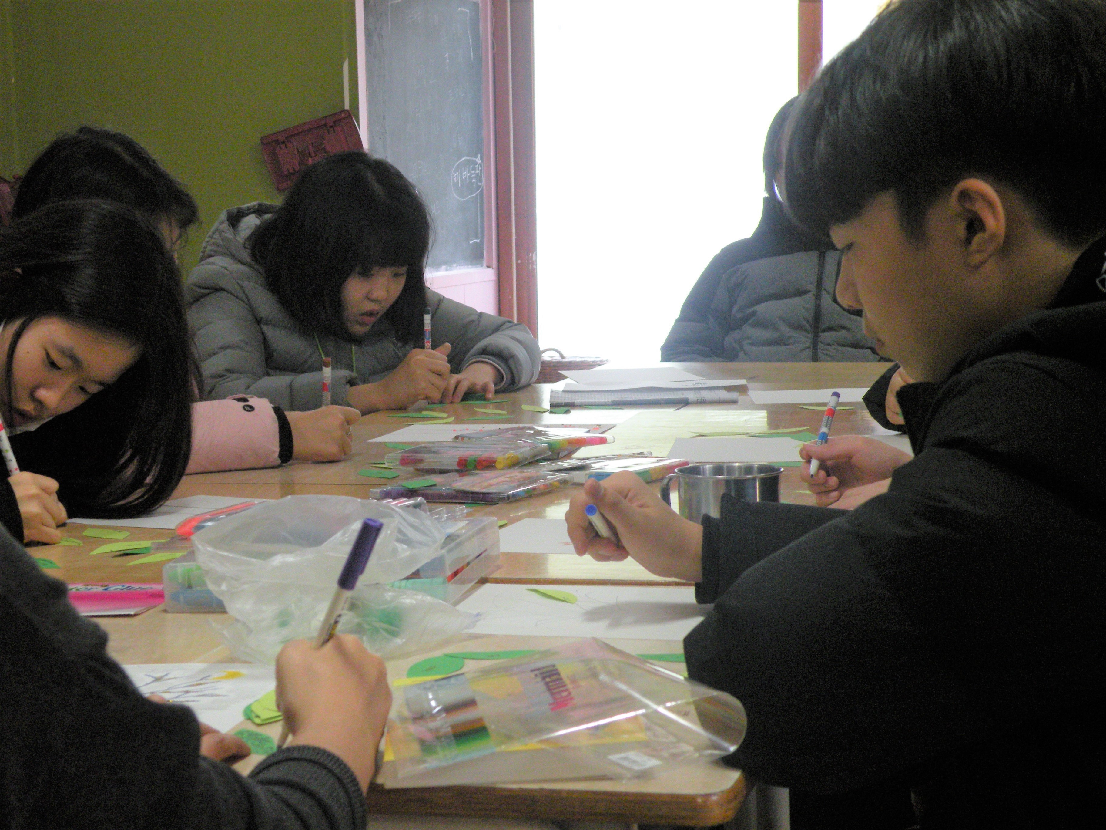 담임선생님과 1학년들만 모여서 도화지에 각자의 나무를 그리고 그 나무를 소개하고 잎사귀에 각각의 친구들과 담임선생님에게 짧은 편지를 써 줍니다.