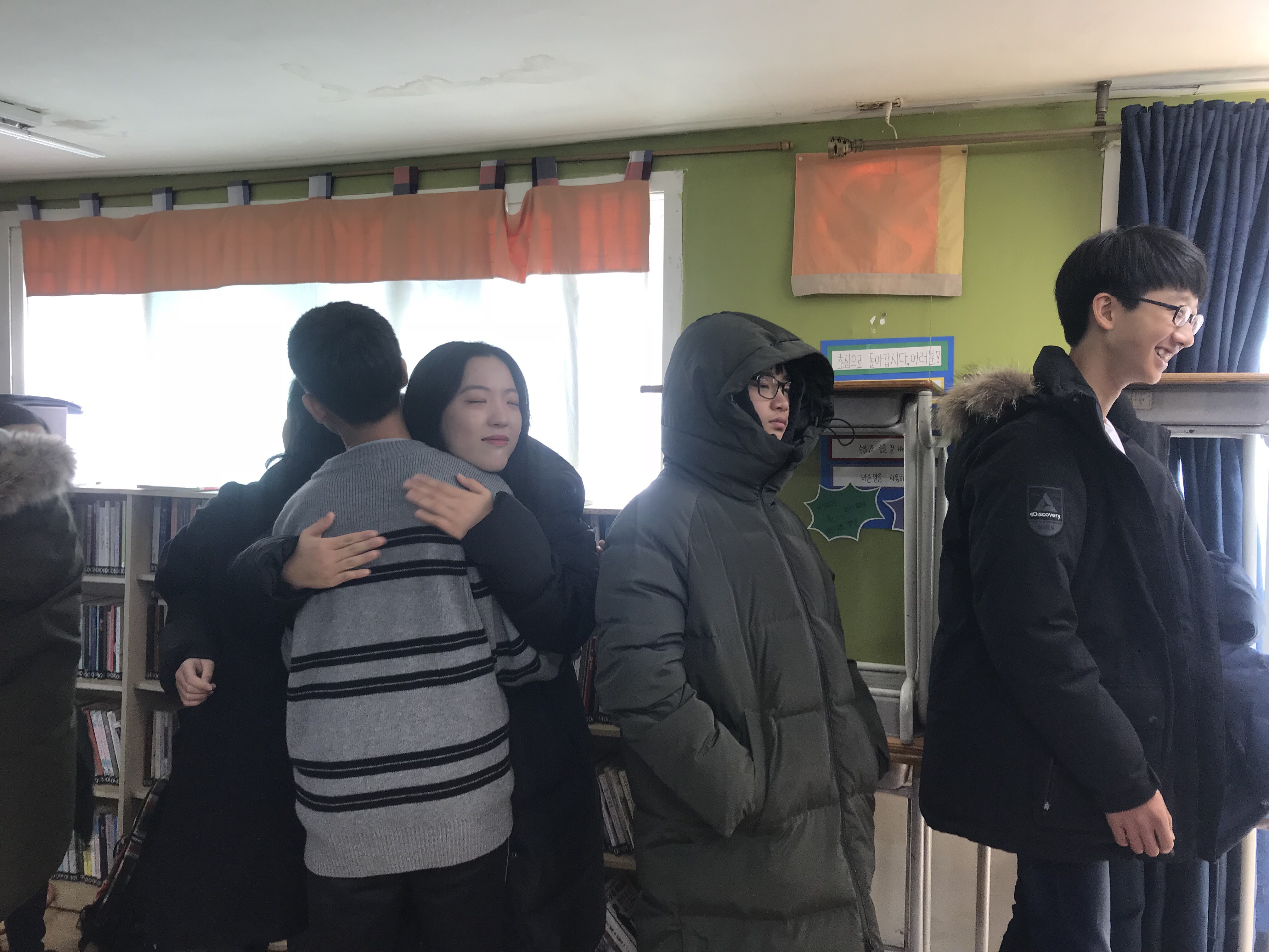 담임 발표 후 악수와 포옹으로 인사를 나눴습니다.