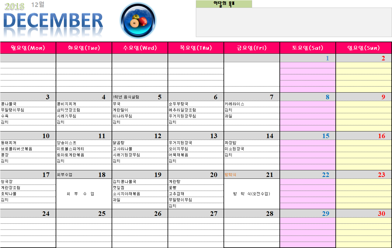 2018년 12월 식단표 작성자 유 성미 작성일 2018-11-28 14:43 조회 2013 좋아요 0 싫어요 0 인쇄 전체 0 추천순 작성순 최신순 댓글을 남기려면 로그인하세요. « 2018년 12월 학교행사 일정 안내 임시 총회 및 평가회를 알립니다. » 목록보기 답글쓰기 Powered by KBoard