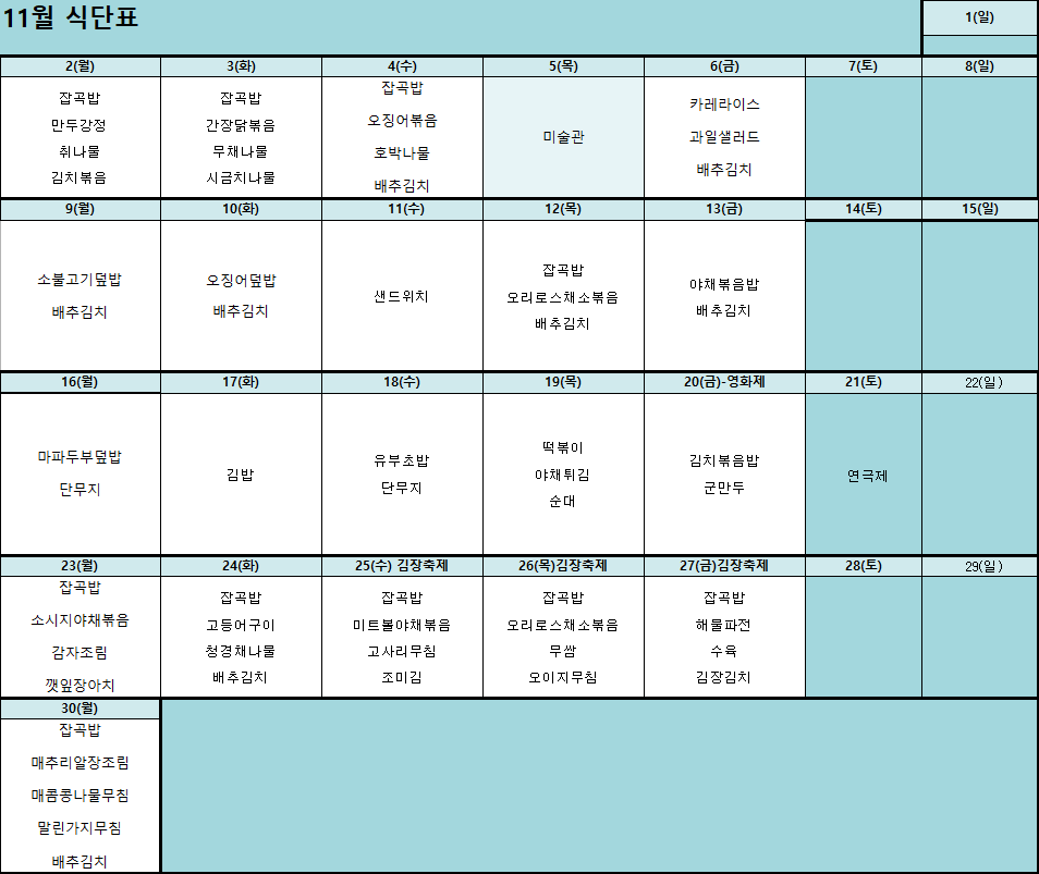 11월 식단표를 안내해드립니다. 작성자 Noah 작성일 2020-11-06 11:03 조회 1811 좋아요 1 싫어요 0 인쇄 전체 0 추천순 작성순 최신순 댓글을 남기려면 로그인하세요. « 미술관 수업을 안내합니다. 2021학년도 신편입생 1차 서류 전형 결과를 알립니다. » 목록보기 답글쓰기 Powered by KBoard