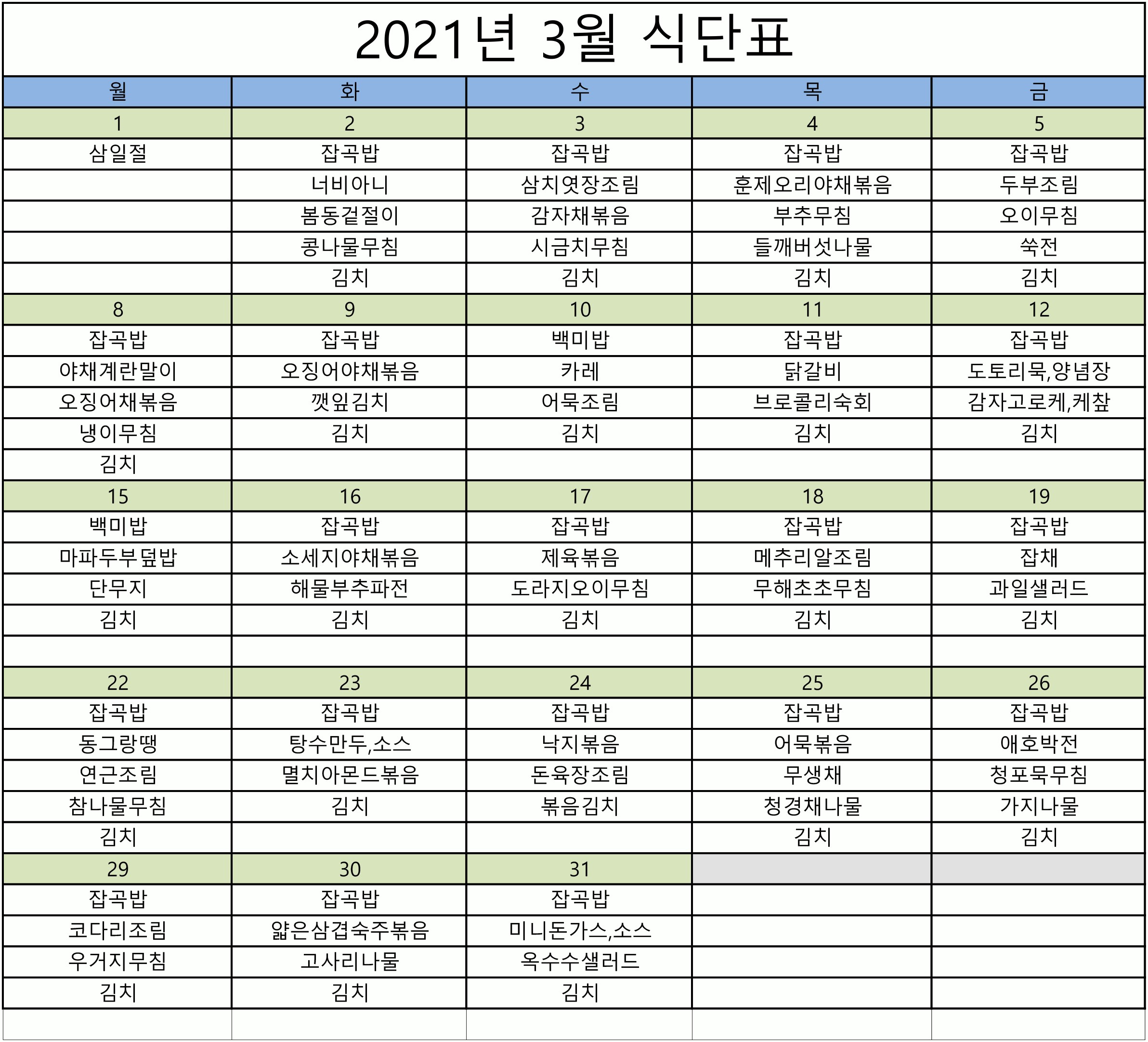 3월 식단표를 알립니다. 작성자 Noah 작성일 2021-03-08 19:44 조회 2025 좋아요 0 싫어요 0 인쇄 전체 0 추천순 작성순 최신순 댓글을 남기려면 로그인하세요. « 2021년 3월 6일 토요일 입학식 행사를 알립니다. 2021학년 3월 3-4주, 방역지침에 근거한 수업계획을 알립니다. » 목록보기 답글쓰기 Powered by KBoard