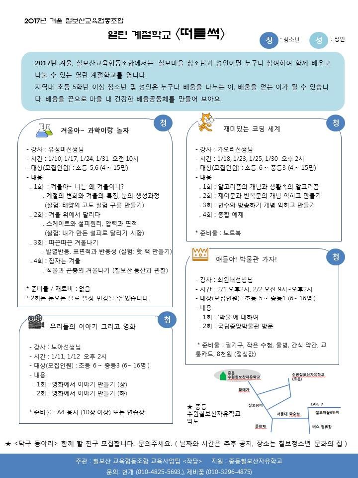 칠보산교육협동조합 교육사업팀 <작당>에서는 겨울방학을 맞은 청소년들과 성인들이 참여할 수 있는 열린 계절학교를 활짝 엽니다!