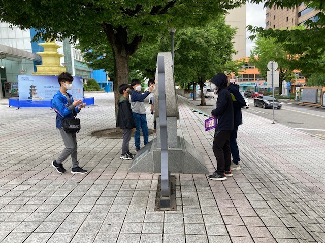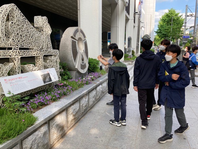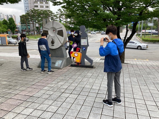 (광주역 앞에서) 학생들은 광주에 '기자'가 되어 갔습니다. 그래서 기념비만 보면 필기구와 수첩을 꺼내듭니다. 지민이는 사진기자로서 취재 현장을 촬영합니다.