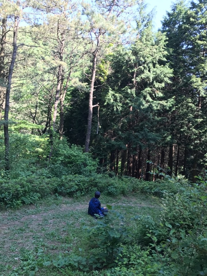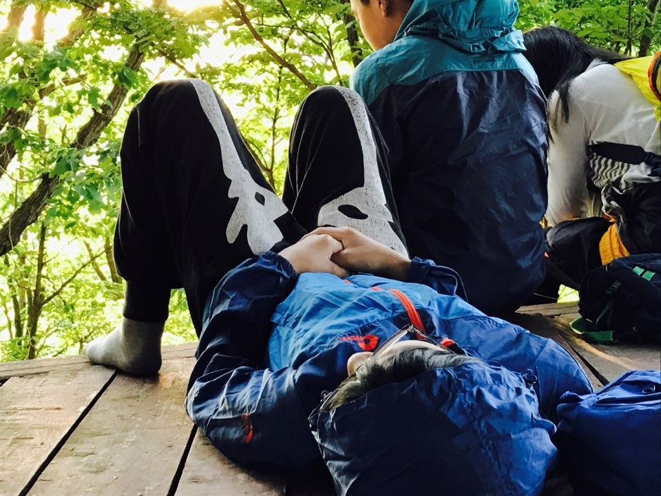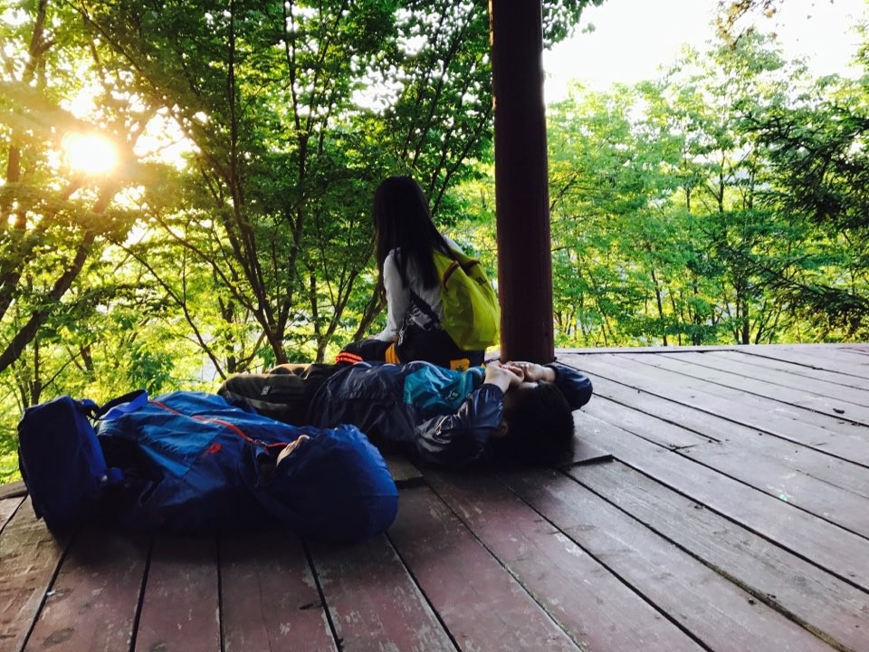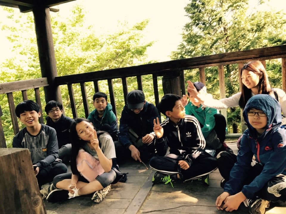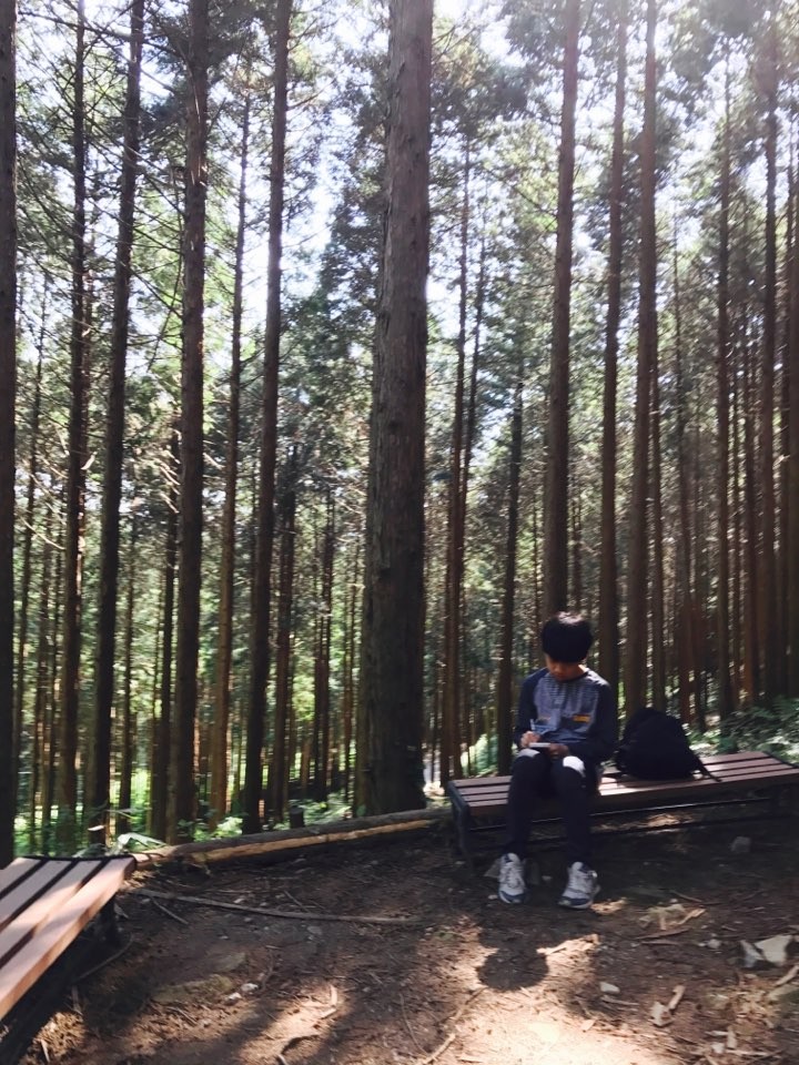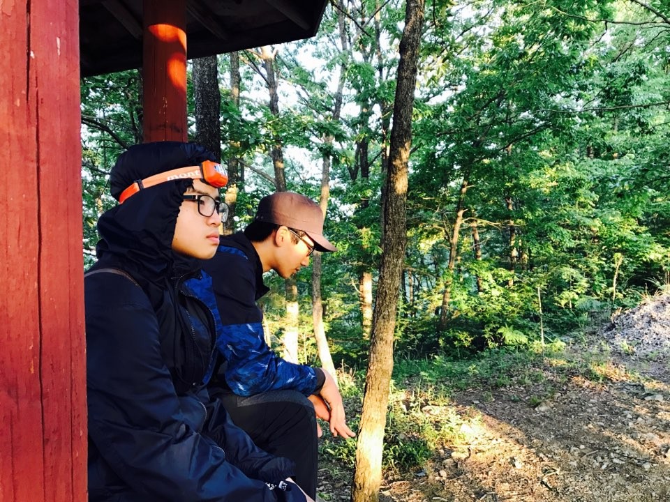 새벽에 먹은 아침이라 아직 시간은 아침인데 점심도시락을 일찍 먹고 숲에서 혼자의 시간을 가지며 글을 씁니다. 민수는 정상에 오르지 못한 아쉬운 마음을 담아 일기를 씁니다. 태경이는 아름다운 숲속에서 새소리들으며 시 몇 편 지어봅니다.