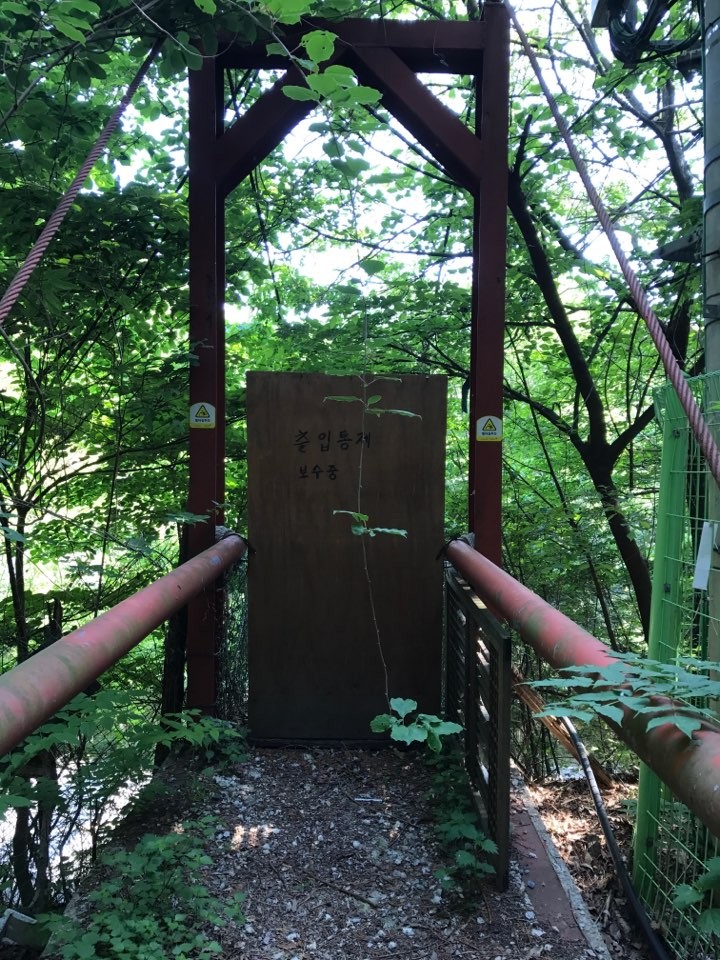 이정표가 있는 곳으로 따라서 가다보니... 우리가 가야할 산을 향하는 다리가 보입니다. 이 다리를 건너면 눈앞의 산을 오를 수 있을 텐데....건너야 갈 수 있는 유일한 다리가 보수중이라 하네요. 결국 눈앞에서 산은 오르지 못하고 새벽부터 5시간이상을 산을 헤맸습니다. 고생 끝에 밀려오는 성취감을 느끼고 싶었는데... 실망과 절망 ~ 하! 새벽부터 일어나 이렇게 돌아다녔는데... 정상을 오르지못하다니.