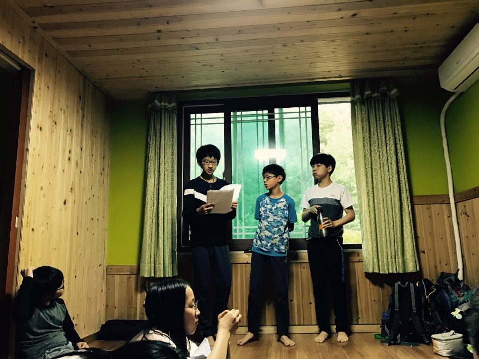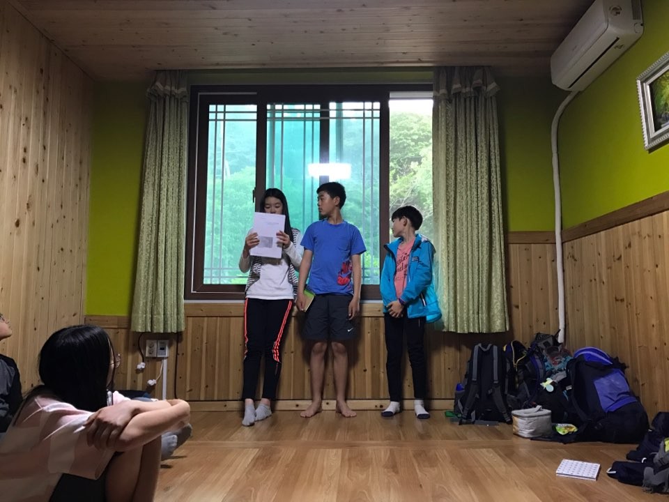 시간이 되었으니 숙소로 돌아가 5월18일을 기념하여 민주주의라는 주제로 활동을 합니다. 첫 번째 순서는 518관련 골든벨! 여행 다녀오기 전에 봤던 영화와 모둠발표, 그리고 17일에 체험하고 관람했던 것들에 대한 정보를 모아 시작합니다. 세 명씩 세 줄로 앉아 각자의 종이에 질문에 대한 답을 적어 머리위로 올립니다.