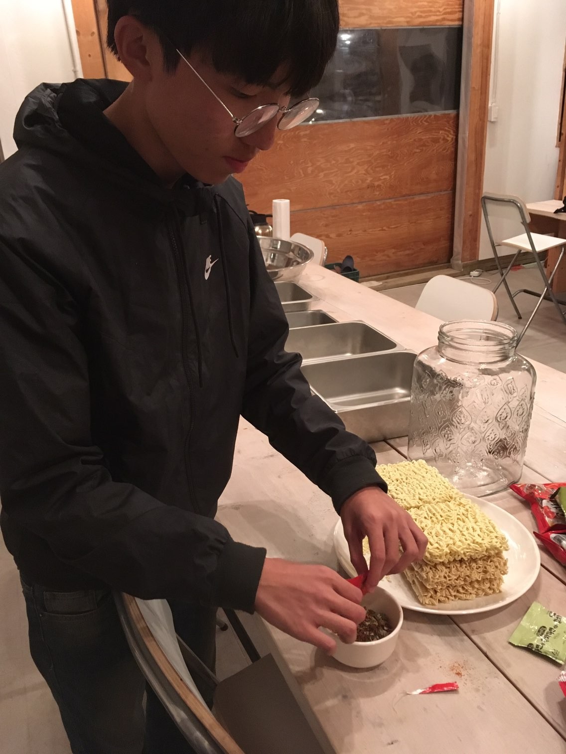 바로 조리동으로 향했습니다. 오늘 저녁 메뉴는 라면이었습니다. 준서가 끓이겠다고 해서 같이 끓이기로 했습니다. 지수가 먼저 물을 올렸고 준서와 저는 라면 봉지와 스프를 뜯어두었습니다. 물이 끓고 면을 넣습니다. 스프를 넣으며 간을 보다가 다 털어넣었는데 약간 싱겁지만 먹을만은 했습니다. 라면을 먹고 있는데 협업 농장에서 일하시는 분이 들어오셔서 '이쪽에 있는 간식거리들 먹어도 된다'고 하십니다. 초코바와 귤, 빵이었는데 엊그제 모두 눈독을 들였던 것입니다. 제가 우리 꺼 아니라고 단칼에 그 눈길들을 잘라버렸는데 알고 보니, 저희 먹으라고 쪽지를 붙여두었다고 하십니다. 그런데 그 쪽지는 사라져 있었고 저희는 그림의 떡을 보는 것마냥 침만 흘리고 있었습니다. 먹을 게 끊이지를 않습니다. 너무 잘 먹고 있습니다.