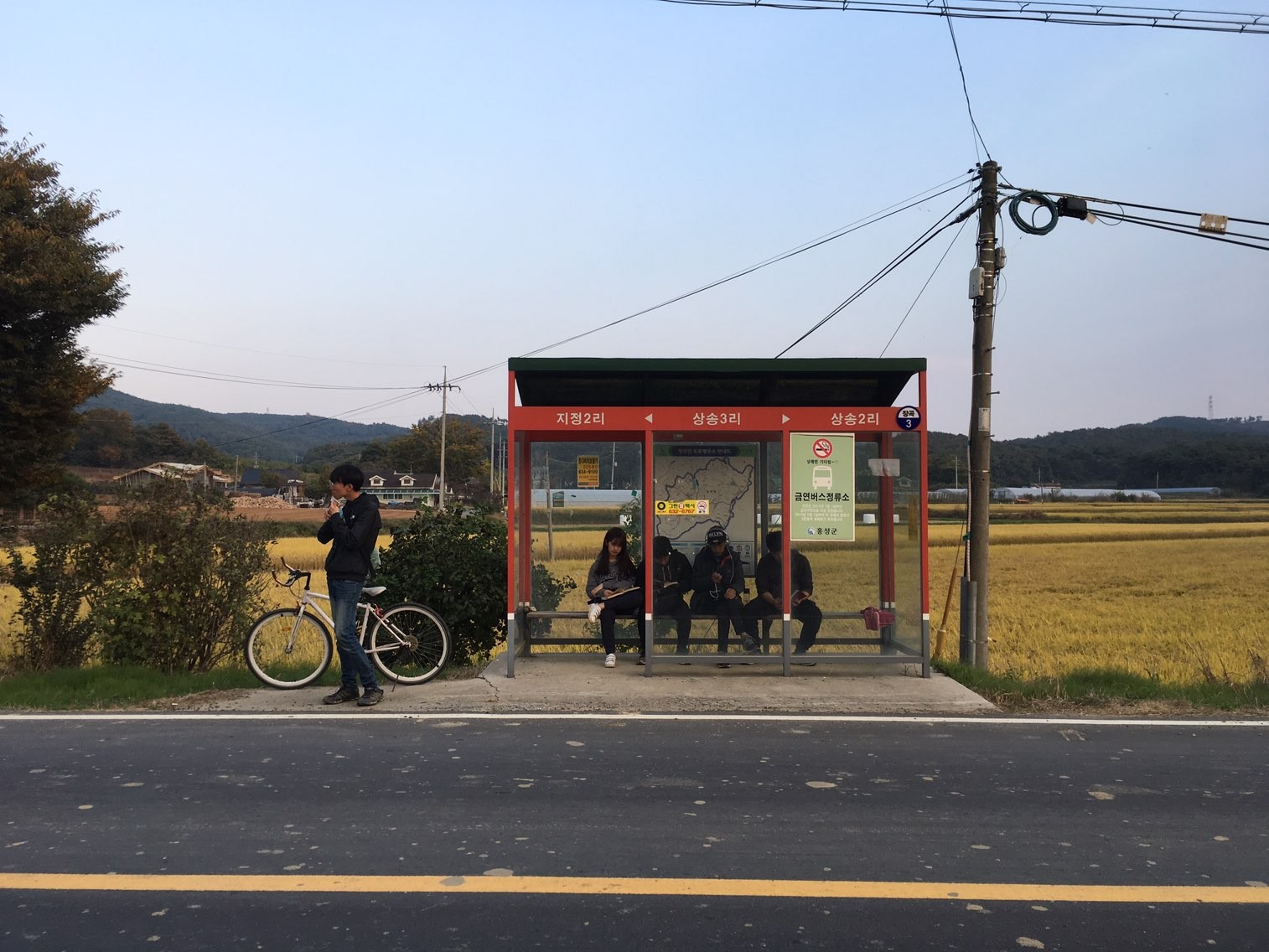 7시 55분. 장곡으로 가는 마지막 버스입니다. 이 버스를 놓치면 1시간을 걷거나 택시를 불러야 합니다. 그래서 20분 전부터 정거장에 서서 기다렸습니다. 옆에서 웃고 떠드는 아이들을 보니 재미있습니다. 저 때가 저런 때였지 싶습니다. 버스가 왔습니다. 막차라 그런지 적막합니다. 버스 안에 등은 환하게 켜져 있지만 하루를 마치고 돌아가는 이들을 태우고 어둠이 깔린 논밭과 농가들 사이로 달려서 그런지 경건한 느낌마저 듭니다.