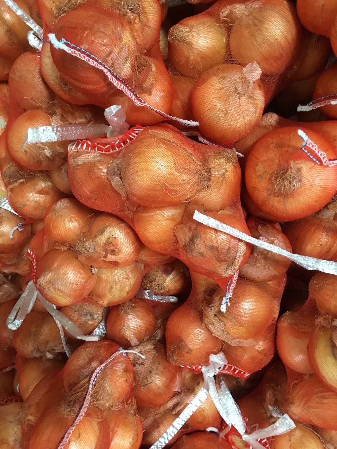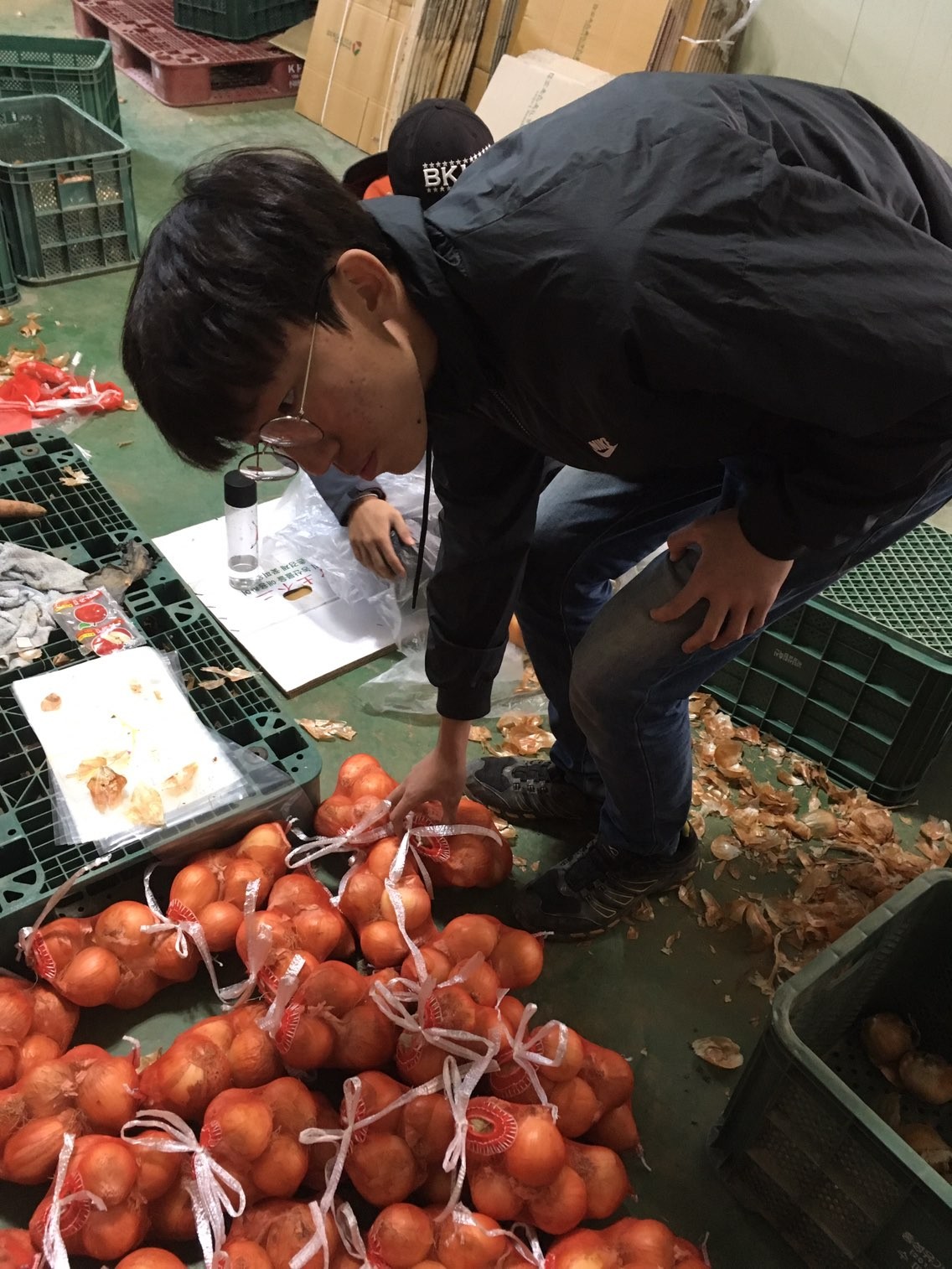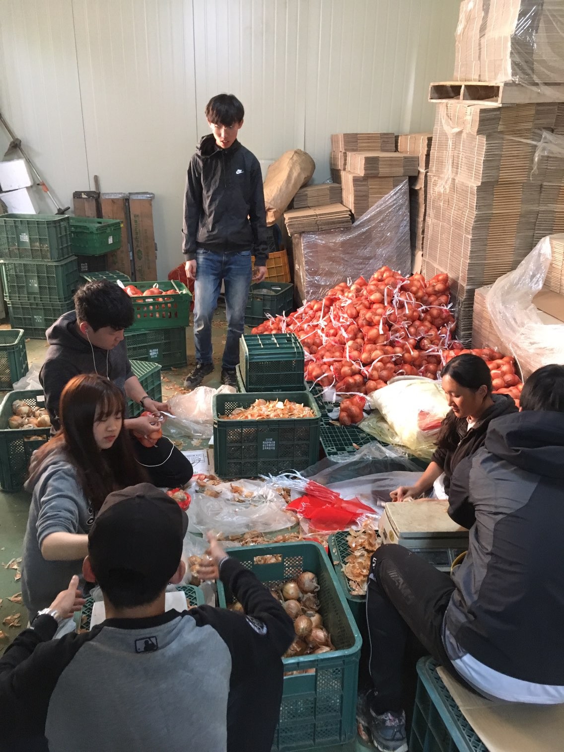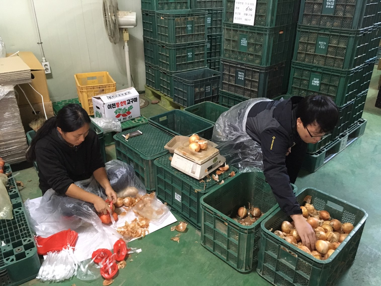 저희는 모두 자리를 잡고 앉았습니다. 과정은 이렇습니다. 한 명이 양파를 1kg에 맞춰 무게를 답니다. 1kg만큼의 양파를 다음 사람이 넘겨받으면 양파를 빨간 망에 집어넣습니다. 그렇게 포장이 되면 다음 사람이 받아서 한쪽에 차근차근 쌓습니다. 그렇게 양파가 어느 정도 쌓이면 생산자 이름표와 바코드 스티커를 끈에 붙여 다른 박스에 차곡차곡 넣습니다. 여기까지 하면 저희의 임무는 끝납니다.