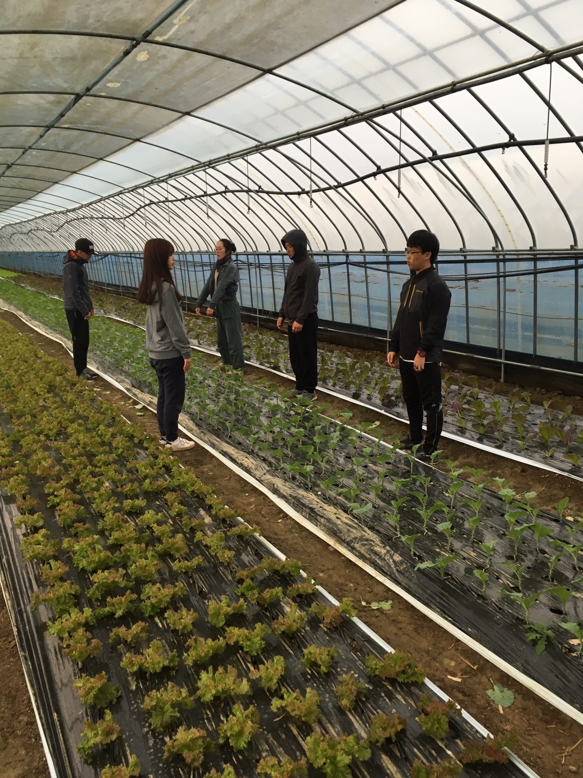 여느 때와 마찬가지로 체조를 했습니다. 다만 다른 점이 있다면 추워서 하우스 안 밭과 밭 사이에 서서 했다는 것입니다.