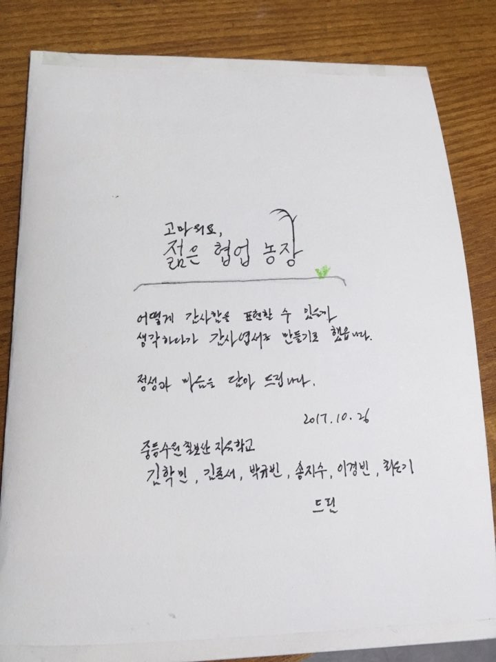 여기서 배운 것들을 꽁꽁 싸매어 학교로 갖고 가겠습니다. 그리고 학교에서도 여기서 배운 농적 삶을 실천하기 위해서 애를 써야겠습니다.