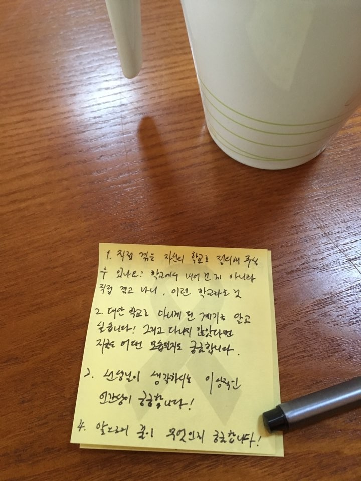 강의는 4시에 시작했고 저녁 식사는 대략 6시 20분쯤 했습니다. 즉 강의부터 저녁 식사까지 약 4시간 20분이 있는데 그 중 20분은 쉬는 시간이었습니다. 2시간씩 4시간을 꼬박 앉아서 강의를 들었습니다. 마을경영에 대한 내용이었는데 열심히 받아적고 집중해서 듣던 저조차 지루하고 힘들어지는 순간이 있었습니다. 저도 이런데 학생들은 오죽할까요. 그래도 학생 5명 모두 잠깐 화장실을 다녀오는 걸 제외하고 모두 자리를 끝까지 지켰습니다. 나중에 같이 수업에 참여하신 이은정 선생님이 애들 대단하다고 하시는데 괜히 한 번 더 뿌듯했습니다. 지루하고 무슨 얘기인지 이해하기 힘들 수도 있는 내용을 계속 듣고 앉아있는 게 그리 추천하고 싶은 건 아니지만 끝까지 인내하고 앉아있었던 건 참 대단하다 싶습니다. 이렇게 힘든 수업이었지만 소득도 있습니다. <마을 경영>에 대한 책을 한 권씩 받았고 지수, 규빈, 저는 퀴즈를 맞추고 상품도 받았습니다. 지수는 오늘 오전에 바질 수확을 했는데 상품은 바질 화분이 나왔습니다. 상품을 받아서 좋기는 한데 바질 화분이라 아쉬워합니다. 규빈은 뚜껑이 있는 머그잔, 저는 길쭉한 물병을 받았습니다. 강의 수강 후 당연히 나눔을 했습니다. 지루하고 힘든 건 일단 뒤로 밀어두고 그래도 듣고 기억에 남고 나누고 싶은 내용들이 있는지 함께 이야기하고 정리했습니다.