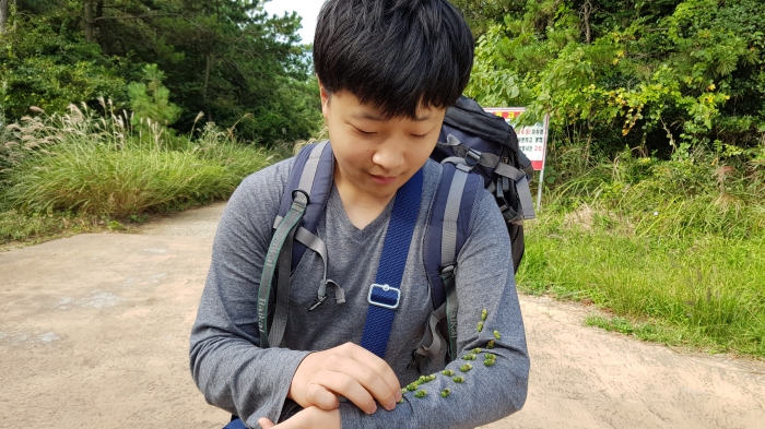 한결이 팔에 있는 것들이 도깨비풀처럼 던지면 옷에 붙는 열매이다.